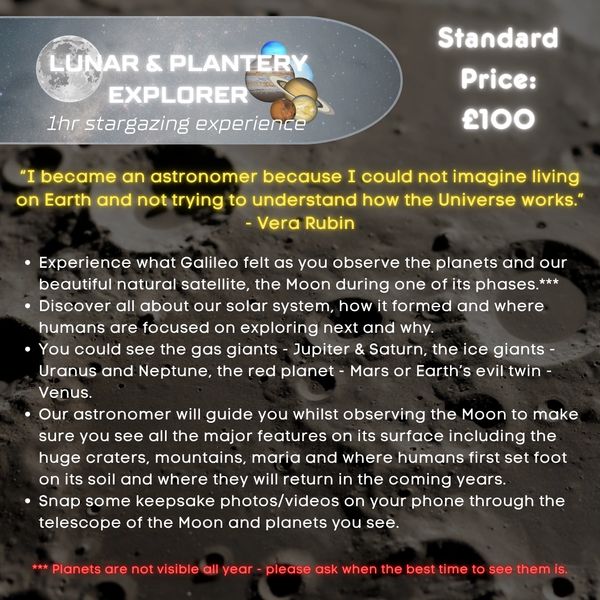 Feel like Galileo and explore the visible planets of our solar system and our beautiful natural satellite. You may see the planets of Venus, Mars, Jupiter, Saturn, Uranus & Neptune as well as the stunning detail of our Moon. Our astronomer will give you insights into upcoming missions searching for life and we'll take some photos/videos of what you see, along with ever lasting memories.